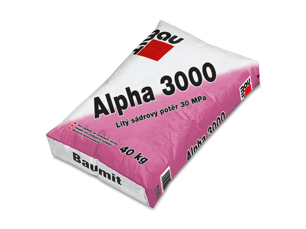 Použití: Baumit Alpha 3000 je samonivelační litý potěr pro použití v interiéru. Může být použitý na všechny běžné podkladové minerální materiály, popř. na vyspravení podkladního potěru. Tvoří podkladní vrstvu pro všechny typy podlahovin, jako např. dlažba, koberce, parkety apod. Není určen pro povrchy namáhané obrusem.